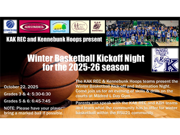 RSU21 YOUTH BASKETBALL BALLERS: It's hard to believe we are nearing the start of basketball season already! In preparation for the upcoming season, KBH and RSU21 Recreational Departments are hosting an Information Night Wednesday, October 22rd at MLD Gym in Arundel (two sessions, times are above). During this time we’ll discuss options for our RSU21 girls and boys hoopsters. We’ll cover expectations for KBH travel teams for this season (i.e. evaluation process, commitment and length of season, details on costs to play, etc) – as well as share the plans for the Local REC programs in helping to provide a program focused on player development. We will have plenty of time to field questions you have.As a reminder, Kennebunk Hoops supports children in RSU21 from grades 3-6 primarily who are interested in playing basketball at a competitive level. Some of our board members will be running some fun games and skills for the players, so please feel free to bring your player along to have some fun! (Please bring a marked basketball).